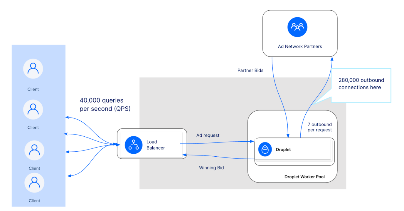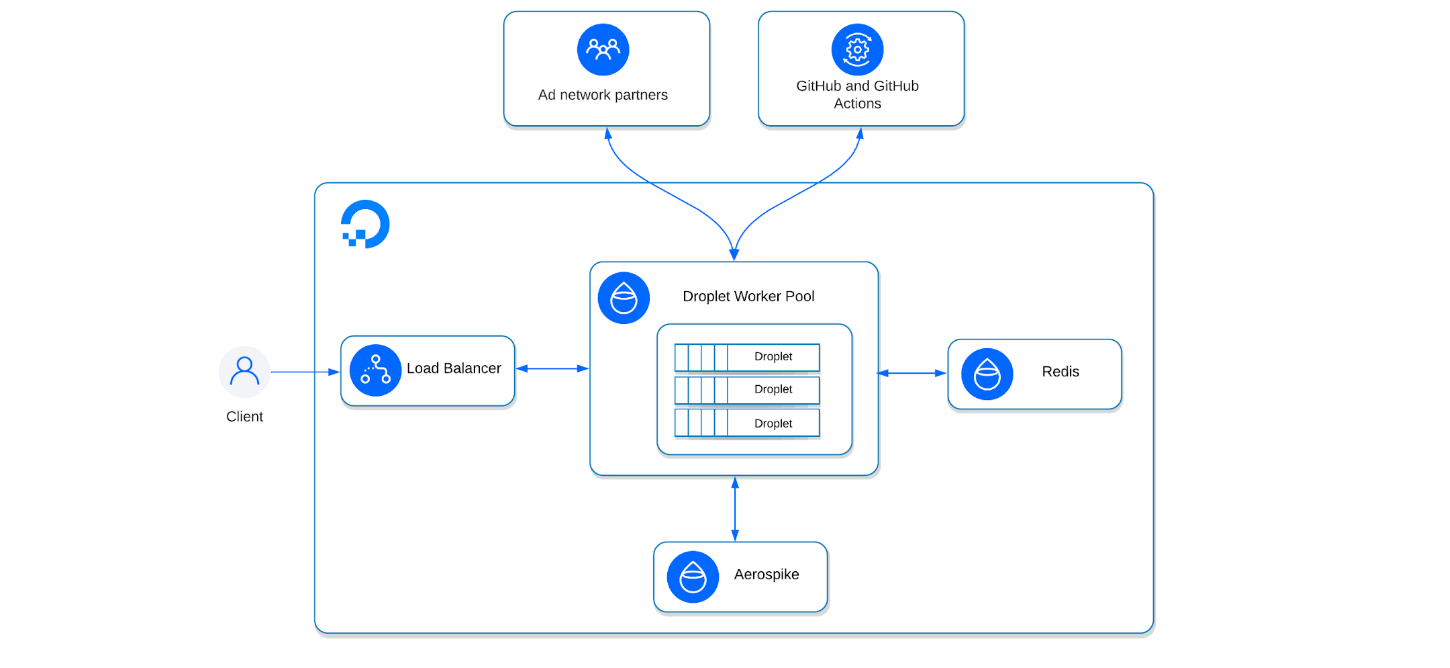 To do this, Origin uses 25 DigitalOcean Droplets operating behind a DigitalOcean Load Balancer. The Droplets function as stateless, algorithmic engines that exist to receive instructions and data about existing campaigns and receive bid requests from partners. Origin can receive upwards of 40,000 queries per second (QPS) and for every request that comes in, the Droplet opens up seven outbound connections to the ad partners to receive bid requests. Once the Droplets receive the bid requests, they will pick a winning bid response. They will then relay that information back to the supply partner, responding to the original request that came through the load balancer.